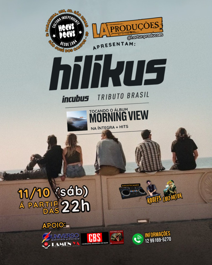 Ajude o site a se manter comprando através dos links patrocinados Camiseta Ozzy Ozbourne Bark at the Moon Disponível na Camiseta Metallica Master of Puppets Disponível na Camiseta Dio Holy Diver Disponível na Camiseta Angra Angels Cry Disponível na Camiseta Iron Maiden Fear of The Dark Disponível na Camiseta Slayer Skullgram Disponível na Camiseta Anthrax Fistful Disponível na Camiseta System Of A Down Disponível na Camiseta Clássica Ramones Disponível na Camiseta Iron Maiden Killers Disponível na Camiseta Metallica Black Album Disponível na Camiseta Bathory Disponível na Camiseta Camiseta Megadeth Countdown To Extinction Disponível na Consulado do Rock, Camiseta Gojira From Mars To Sirius Preto Consulado OF0255 Disponível na Camiseta Nervosa Jailbreak Disponível na Camiseta Camiseta AC/DC Back In Black Disponível na Camiseta Angra Holy Land Disponível na Camiseta Engraçada Death Metal Arco Iris Banda De Rock Disponível na Camiseta Black Sabbath Us Tour 78 Disponível na Camiseta Camiseta Judas Priest Painkiller Disponível na It starts with one - Edição com brindes: A lenda e o legado do Linkin Park Disponível na O Livro dos Mortos do Rock: Revelações sobre a vida e a morte de sete lendas do Rock'n'Roll Disponível na Camiseta Nervosa Perpetual Chaos Disponível no Camiseta Ratos de Porão - 1981 Disponível no Camiseta Sepultura - Turnê de despedida Disponível no Camiseta Clássica Red Hot Chilli Peppers Disponível no Camiseta Matanza Odiosa Natureza Humana Disponível no Camiseta Crypta Disponível no Camiseta Bon Jovi - Greatest Hits Disponível no Camiseta Krisiun Necronomical Disponível no HILIKUS - INCUBUS TRIBUTO BRASIL NO HOCUS POCUS @ São José Dos Campos - SP      » Não perca outros eventos acontecendo em: São José Dos Campos - SP Data: 11 Oct 2025 Endereço: Hocus Pocus Studio & Cafe, Rua Paraibuna 838, Jardim Sao Dimas Ingressos: Sympla Ajude o site a se manter comprando através dos links patrocinados O Último Ritual: As memórias finais de Ozzy Osbourne Disponível na Autobiografia Eu sou Ozzy (Edição especial com brindes) Disponível na Livro Iron Man: Minha jornada pelo céu e pelo inferno com o Black Sabbath Disponível na Livro Death By Metal: A História de Chuck Schuldiner Disponível na Tênis Cano Alto Slipknot Disponível no Livro Lords of Chaos Disponível na Helloween. A História Completa Disponível na Autobiografia Lemmy Kilmister - A febre da linha branca Disponível na Livro Black Metal: A História Completa - Volume 1 Disponível na AC/DC: Álbum por Álbum Disponível na Livro Contos do rock: Histórias dos bastidores do rock brasileiro Disponível na Chaveiros emborrachados de bandas Disponível no Down with the System: Um livro de memórias (ou algo assim) Disponível na Rainbow in the Dark. A Autobiografia Disponível na Livro O Reino Sangrento do Slayer Disponível na Livro A História não Contada do Motörhead Disponível na Livro Black Metal: A História Completa - Volume 2 Disponível na Livro Mate-me por Favor: a História sem Censura do Punk Disponível na Braceletes Duplos de Couro Preto c/ 4 Fivela Ajustável Disponível no Livro Iron Maiden: Álbum por Álbum Disponível na Livro Led Zeppelin: A Biografia Disponível na