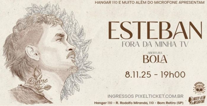 Ajude o site a se manter comprando através dos links patrocinados Camiseta Ozzy Ozbourne Bark at the Moon Disponível na Camiseta Metallica Master of Puppets Disponível na Camiseta Dio Holy Diver Disponível na Camiseta Angra Angels Cry Disponível na Camiseta Iron Maiden Fear of The Dark Disponível na Camiseta Slayer Skullgram Disponível na Camiseta Anthrax Fistful Disponível na Camiseta System Of A Down Disponível na Camiseta Clássica Ramones Disponível na Camiseta Iron Maiden Killers Disponível na Camiseta Metallica Black Album Disponível na Camiseta Bathory Disponível na Camiseta Camiseta Megadeth Countdown To Extinction Disponível na Consulado do Rock, Camiseta Gojira From Mars To Sirius Preto Consulado OF0255 Disponível na Camiseta Nervosa Jailbreak Disponível na Camiseta Camiseta AC/DC Back In Black Disponível na Camiseta Angra Holy Land Disponível na Camiseta Engraçada Death Metal Arco Iris Banda De Rock Disponível na Camiseta Black Sabbath Us Tour 78 Disponível na Camiseta Camiseta Judas Priest Painkiller Disponível na It starts with one - Edição com brindes: A lenda e o legado do Linkin Park Disponível na O Livro dos Mortos do Rock: Revelações sobre a vida e a morte de sete lendas do Rock'n'Roll Disponível na Camiseta Nervosa Perpetual Chaos Disponível no Camiseta Ratos de Porão - 1981 Disponível no Camiseta Sepultura - Turnê de despedida Disponível no Camiseta Clássica Red Hot Chilli Peppers Disponível no Camiseta Matanza Odiosa Natureza Humana Disponível no Camiseta Crypta Disponível no Camiseta Bon Jovi - Greatest Hits Disponível no Camiseta Krisiun Necronomical Disponível no Esteban Tavares - Fora da Minha TV @ São Paulo - SP      » Não perca outros eventos acontecendo em: Sao Paulo - SP Data: 08 Nov 2025 Endereço: Hangar110, Rua Rodolfo Miranda, 110, Bom Retiro, São Paulo, SP, CEP 01121-010 Ingressos: PixelTicket Bandas: Bola Ajude o site a se manter comprando através dos links patrocinados O Último Ritual: As memórias finais de Ozzy Osbourne Disponível na Autobiografia Eu sou Ozzy (Edição especial com brindes) Disponível na Livro Iron Man: Minha jornada pelo céu e pelo inferno com o Black Sabbath Disponível na Livro Death By Metal: A História de Chuck Schuldiner Disponível na Tênis Cano Alto Slipknot Disponível no Livro Lords of Chaos Disponível na Helloween. A História Completa Disponível na Autobiografia Lemmy Kilmister - A febre da linha branca Disponível na Livro Black Metal: A História Completa - Volume 1 Disponível na AC/DC: Álbum por Álbum Disponível na Livro Contos do rock: Histórias dos bastidores do rock brasileiro Disponível na Chaveiros emborrachados de bandas Disponível no Down with the System: Um livro de memórias (ou algo assim) Disponível na Rainbow in the Dark. A Autobiografia Disponível na Livro O Reino Sangrento do Slayer Disponível na Livro A História não Contada do Motörhead Disponível na Livro Black Metal: A História Completa - Volume 2 Disponível na Livro Mate-me por Favor: a História sem Censura do Punk Disponível na Braceletes Duplos de Couro Preto c/ 4 Fivela Ajustável Disponível no Livro Iron Maiden: Álbum por Álbum Disponível na Livro Led Zeppelin: A Biografia Disponível na