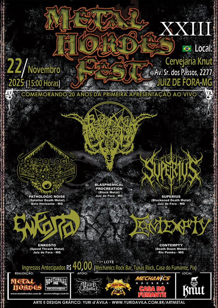 Ajude o site a se manter comprando através dos links patrocinados Camiseta Ozzy Ozbourne Bark at the Moon Disponível na Camiseta Metallica Master of Puppets Disponível na Camiseta Dio Holy Diver Disponível na Camiseta Angra Angels Cry Disponível na Camiseta Iron Maiden Fear of The Dark Disponível na Camiseta Slayer Skullgram Disponível na Camiseta Anthrax Fistful Disponível na Camiseta System Of A Down Disponível na Camiseta Clássica Ramones Disponível na Camiseta Iron Maiden Killers Disponível na Camiseta Metallica Black Album Disponível na Camiseta Bathory Disponível na Camiseta Camiseta Megadeth Countdown To Extinction Disponível na Consulado do Rock, Camiseta Gojira From Mars To Sirius Preto Consulado OF0255 Disponível na Camiseta Nervosa Jailbreak Disponível na Camiseta Camiseta AC/DC Back In Black Disponível na Camiseta Angra Holy Land Disponível na Camiseta Engraçada Death Metal Arco Iris Banda De Rock Disponível na Camiseta Black Sabbath Us Tour 78 Disponível na Camiseta Camiseta Judas Priest Painkiller Disponível na It starts with one - Edição com brindes: A lenda e o legado do Linkin Park Disponível na O Livro dos Mortos do Rock: Revelações sobre a vida e a morte de sete lendas do Rock'n'Roll Disponível na Camiseta Nervosa Perpetual Chaos Disponível no Camiseta Ratos de Porão - 1981 Disponível no Camiseta Sepultura - Turnê de despedida Disponível no Camiseta Clássica Red Hot Chilli Peppers Disponível no Camiseta Matanza Odiosa Natureza Humana Disponível no Camiseta Crypta Disponível no Camiseta Bon Jovi - Greatest Hits Disponível no Camiseta Krisiun Necronomical Disponível no METAL HORDES FEST XXIII @ Juiz De Fora - MG      » Não perca outros eventos acontecendo em: Juiz De Fora - MG Data: 22 Nov 2025 Endereço: Cervejaria Knut, Avenida Senhor dos Passos, 2277, Galpão F Ingressos: Sympla Bandas: Superius Ajude o site a se manter comprando através dos links patrocinados O Último Ritual: As memórias finais de Ozzy Osbourne Disponível na Autobiografia Eu sou Ozzy (Edição especial com brindes) Disponível na Livro Iron Man: Minha jornada pelo céu e pelo inferno com o Black Sabbath Disponível na Livro Death By Metal: A História de Chuck Schuldiner Disponível na Tênis Cano Alto Slipknot Disponível no Livro Lords of Chaos Disponível na Helloween. A História Completa Disponível na Autobiografia Lemmy Kilmister - A febre da linha branca Disponível na Livro Black Metal: A História Completa - Volume 1 Disponível na AC/DC: Álbum por Álbum Disponível na Livro Contos do rock: Histórias dos bastidores do rock brasileiro Disponível na Chaveiros emborrachados de bandas Disponível no Down with the System: Um livro de memórias (ou algo assim) Disponível na Rainbow in the Dark. A Autobiografia Disponível na Livro O Reino Sangrento do Slayer Disponível na Livro A História não Contada do Motörhead Disponível na Livro Black Metal: A História Completa - Volume 2 Disponível na Livro Mate-me por Favor: a História sem Censura do Punk Disponível na Braceletes Duplos de Couro Preto c/ 4 Fivela Ajustável Disponível no Livro Iron Maiden: Álbum por Álbum Disponível na Livro Led Zeppelin: A Biografia Disponível na